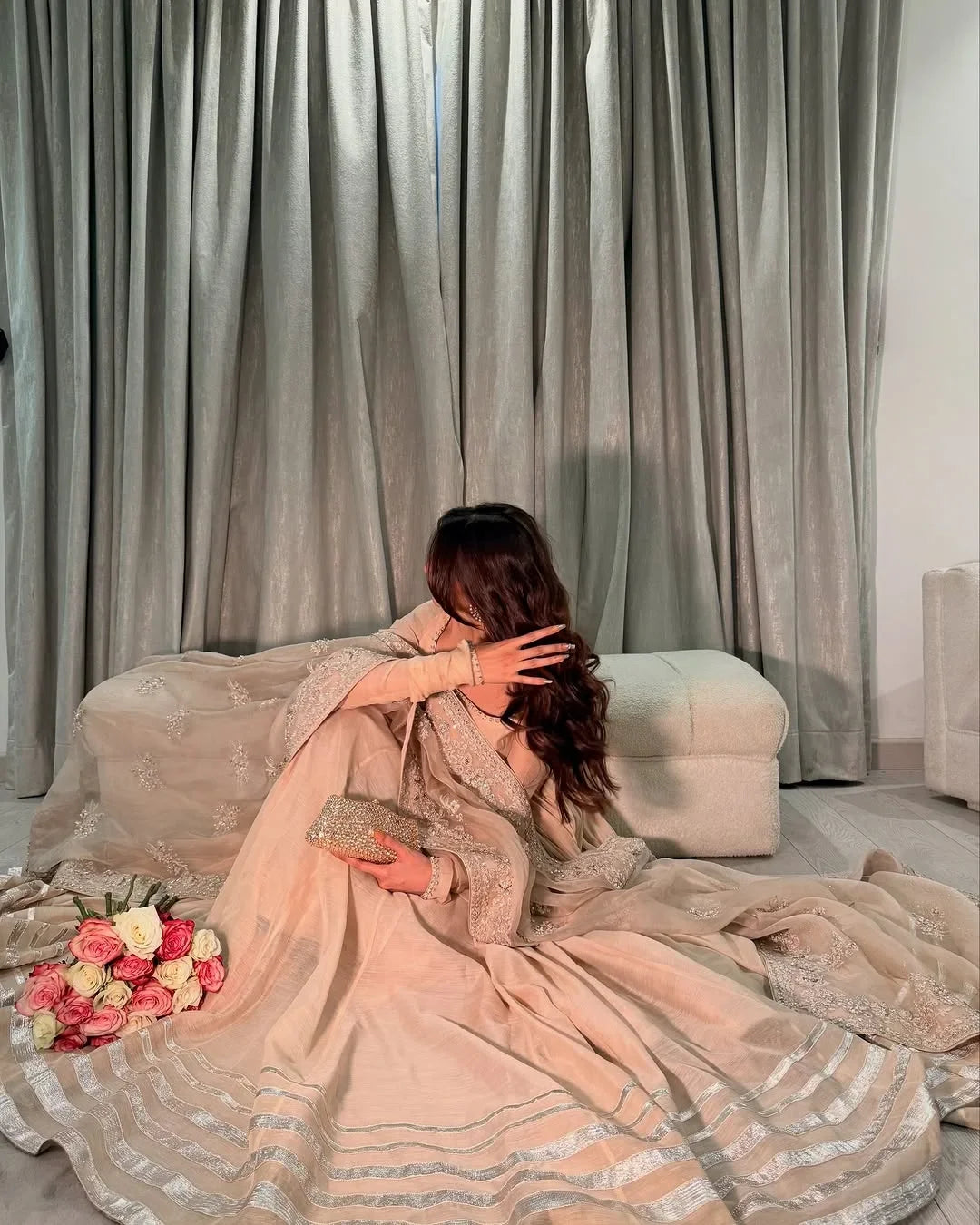🔸 Style: Flowing Anarkali with sheer full sleeves & matching dupatta