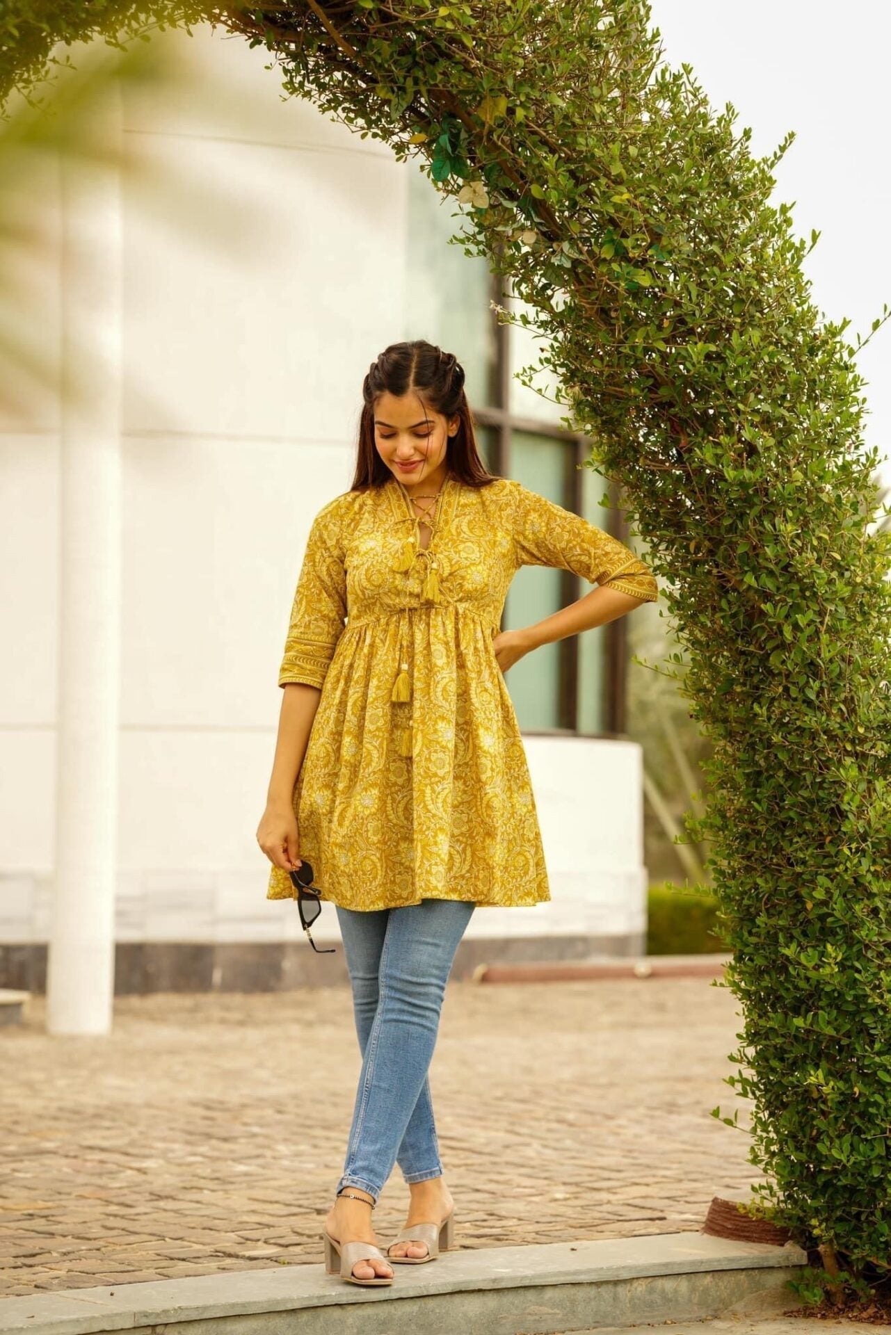 Mustard Floral Print Designer Cotton Top for Women